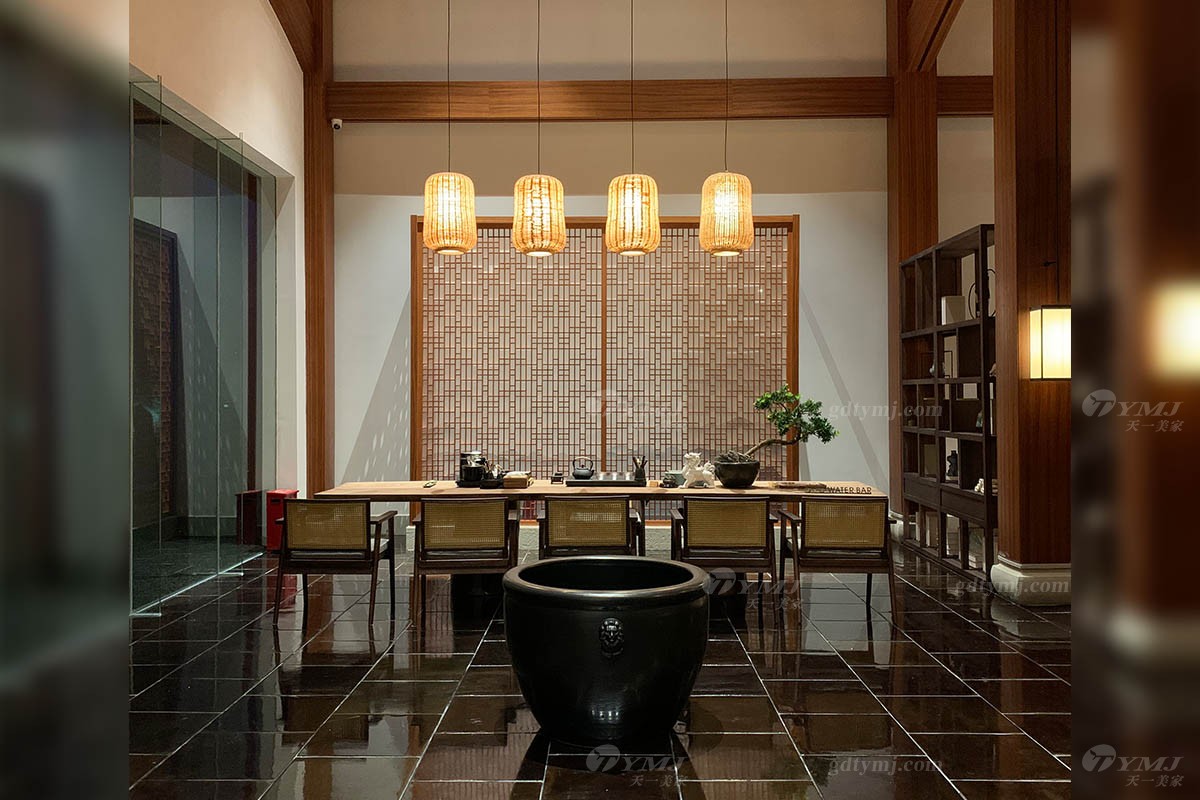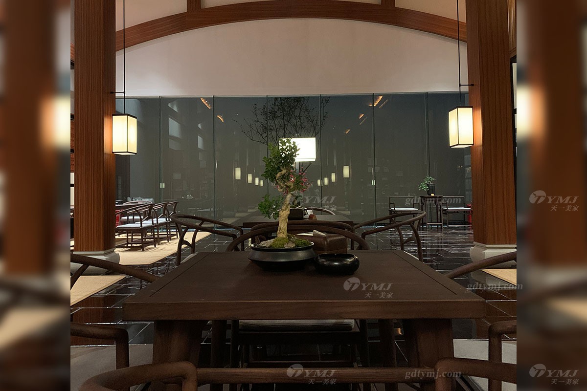 搭配造型多變卻又式樣統(tǒng)一的中式吊燈,高高的掛在空中,中和了空間色調(diào)里的嚴(yán)肅,調(diào)動起生機與活力又不顯突兀。
