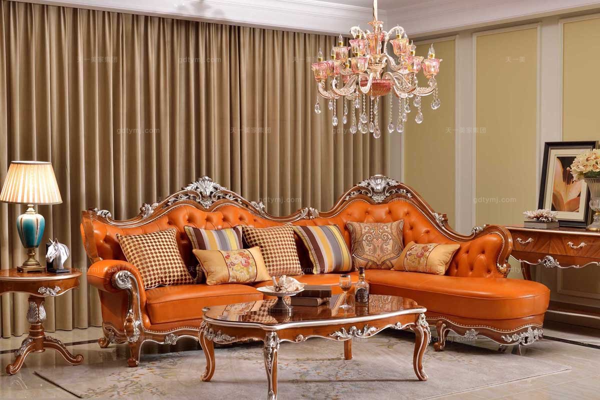 高端別墅品牌家具法式雕花橘紅色真皮轉角沙發